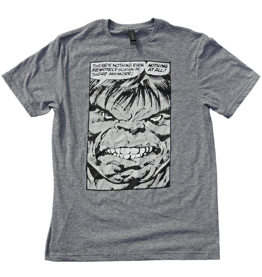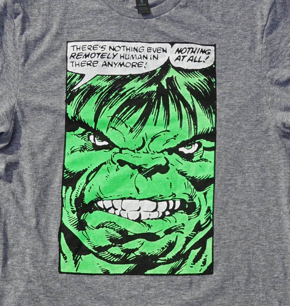 Screen printed on 60% ring-spun cotton and 40% polyester blend t-shirts using water-based inks for soft feel.